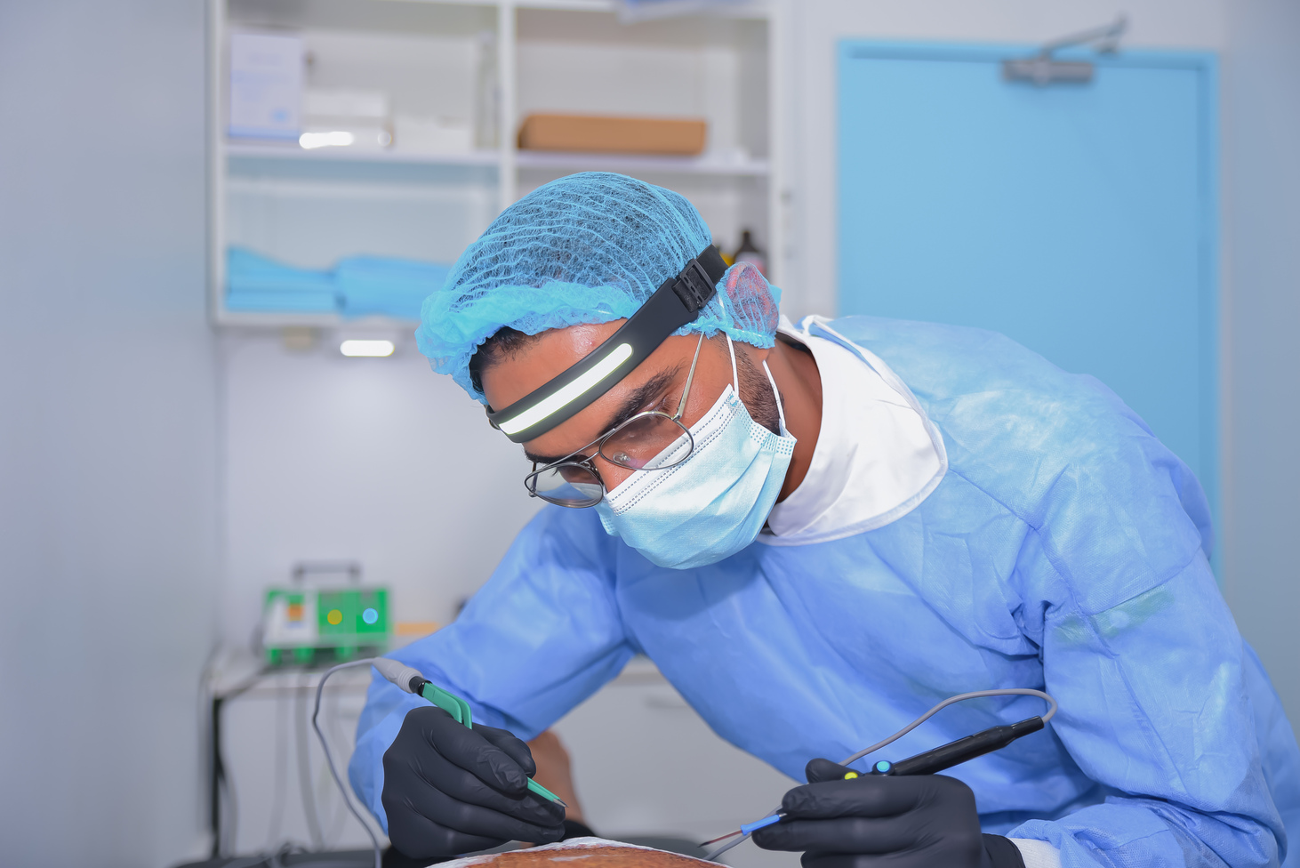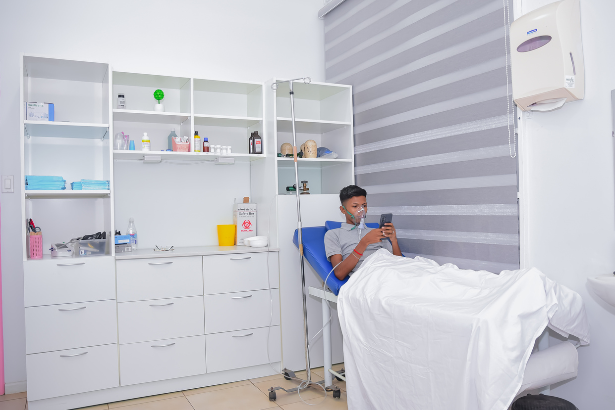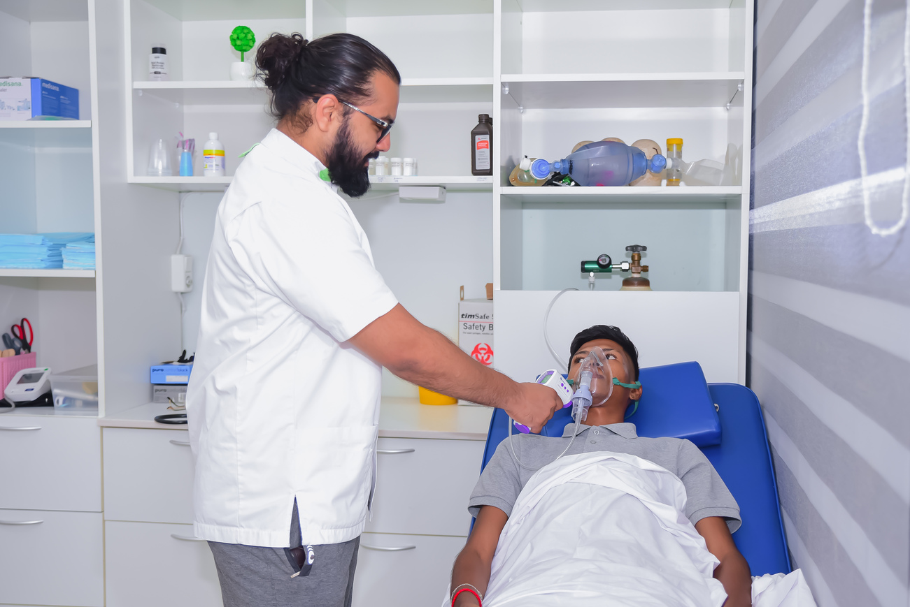 First aid care Oxygen supply when needed. Monitoring vitals. Suturing wounds. Cautarisation. A healthcare worker completes the stitching procedure and ensures the wound is secure.